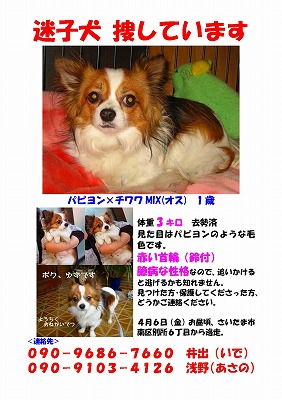 イエーイo(#^^#o ) ゆず君見つかりました( o#^^#)o イエーイ 本日、深夜3時半頃、新聞配達の方が別所沼公園でゆず君を見つけて捕獲。少し痩せてはいるものの、大きな怪我もなく元気だそうです。本当に良かった!! 発見してくれた新聞配達のお兄さん、素敵です! ゆず君、6日間もよく頑張ったね。心細かったでしょう。恐かったでしょう。 お腹も空いてたでしょう。雨も降り寒かったでしょう。。。。 ゆっくり×2と体を休めてね。 せっかく幸せになる為に保護されたのだから・・・・ねっ♪ これが我が子だったらと思うと・・・・普段、我が家の3wanは家の中で首輪をしていません。 散歩時のみ首輪をしています。その首輪には狂犬病の鑑札札と迷子札(各wanの顔写真入り&連絡先等)が付いています。 しかし今回のゆず君の件で、マイクロチップ装着を真剣に考えるきっかけにもなりました。 地震などの災害の時など(いつ、どこで起こるかわからないですもの) 迷子になる可能性が高いですよね。 そこでマイクロチップ装着しているのとしていないのでは、大きな差が出てくると思います。 家だけは大丈夫!は過信し過ぎですよね。。。。。 |