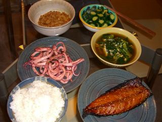 鯖のみりん干しの焼き魚、イカの塩炒め、ほうれん草の味噌汁、納豆、お新香、ご飯でした。