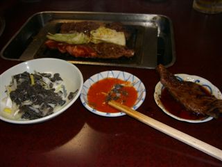 レバ刺し、ユッケ、せんまい、タン塩、カルビ、ビビンバと