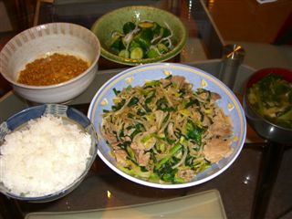肉野菜炒め、納豆、お新香、ほうれん草の味噌汁にご飯。